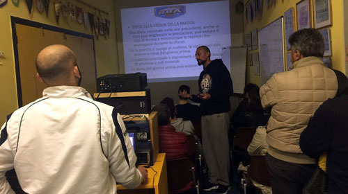 Si è svolto sabato pomeriggio nella sala riunioni del Palasport Estra un incontro tra il responsabile dell’area sanitaria della Scuola Basket Arezzo Simone Marraccini ed il gruppo Under 18 Gold. Il tema affrontato è uno dei più importanti per chi pratica attività sportiva ma troppo spesso sottovalutato, quello dell'”Alimentazione del Cestista”. Genitori e ragazzi si sono intrattenuti per oltre un’ora per apprendere tutte le informazioni necessarie per migliorare anche questo aspetto della vita sportiva degli atleti, in particolare nei momenti precedenti e seguenti allenamenti e partite.